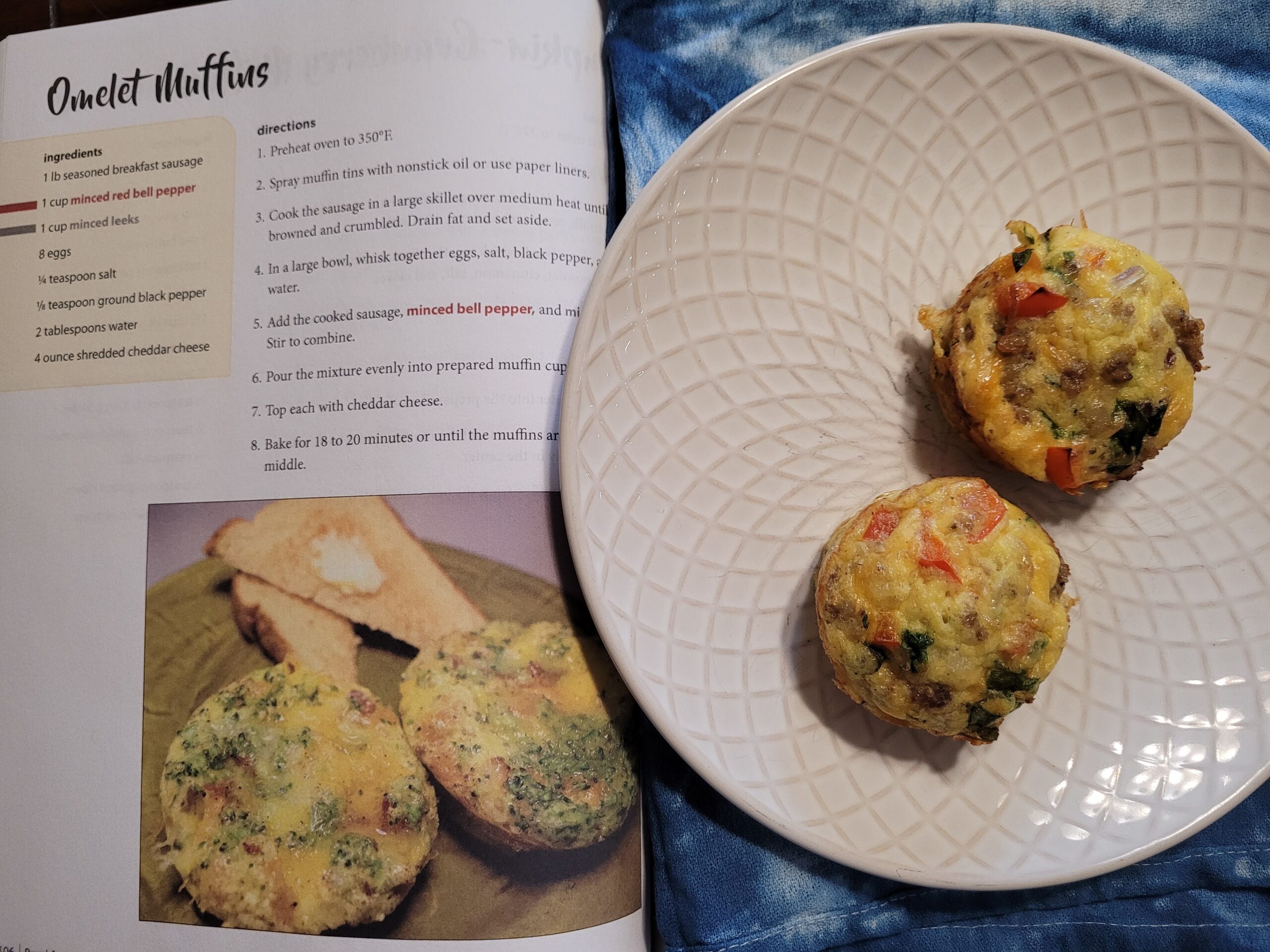 I’ve been wanting some quick grab-and-go breakfasts and her Omelet Muffins (106) sounded like the thing. (Plus they reminded me of Starbuck’s egg bites.) The picture that accompanies this recipe definitely looked like it had broccoli in it (which would be a great idea) but the printed recipe just had red bell pepper and minced leeks. I decided to tweak the recipe a bit and replace the leeks with red onions, decrease the sausage amount, and add some spinach. Here’s what I came up with.