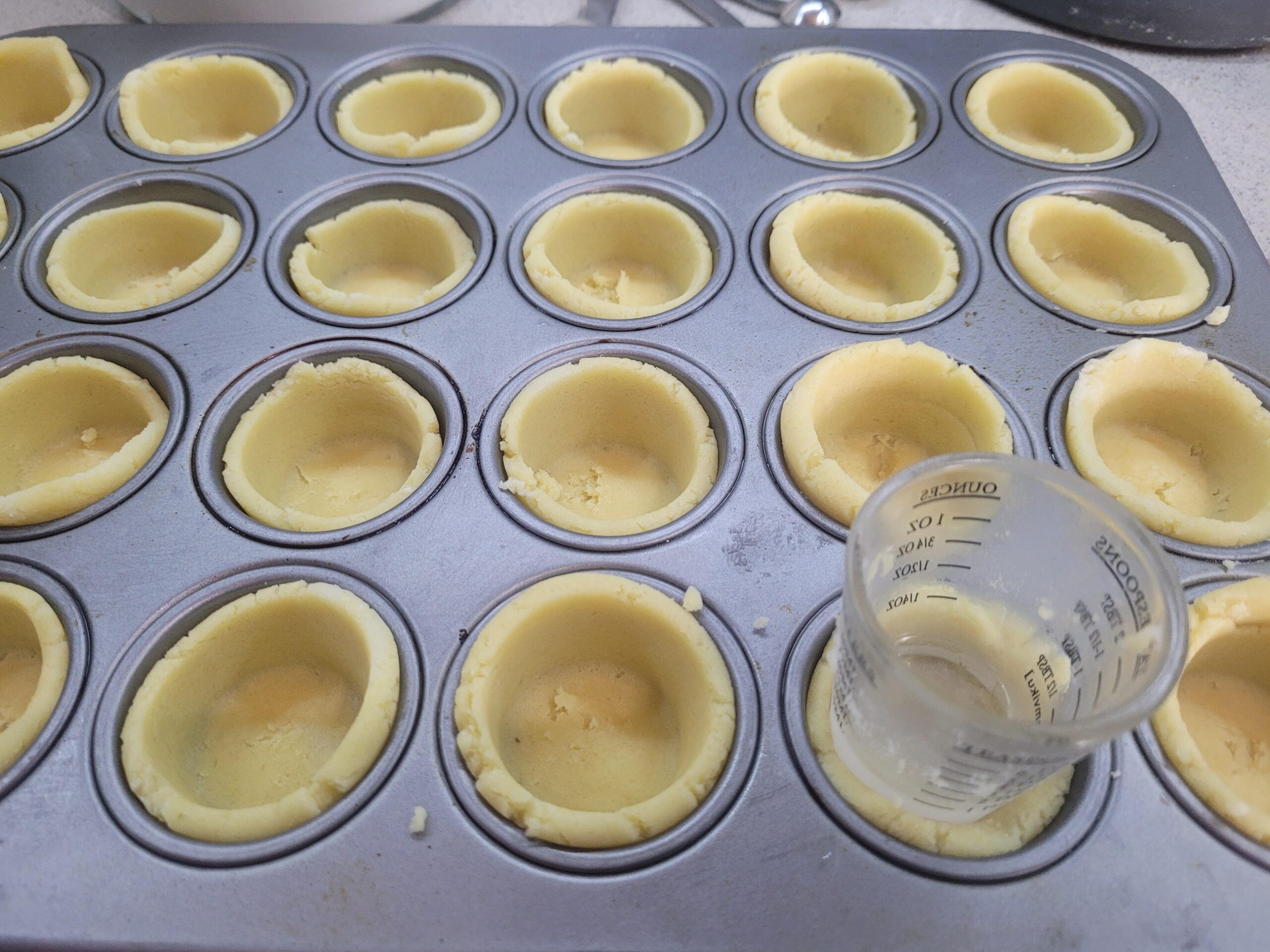 - Form between 1-2” balls (depending on the size of your muffin tins. (I used a medium “mini” tin so my shells were formed from about 2” balls of dough. Press each ball evenly into the bottom and up the sides of the tins. A shot glass was the perfect size to press the dough into my muffin cups. Chill until ready to use.