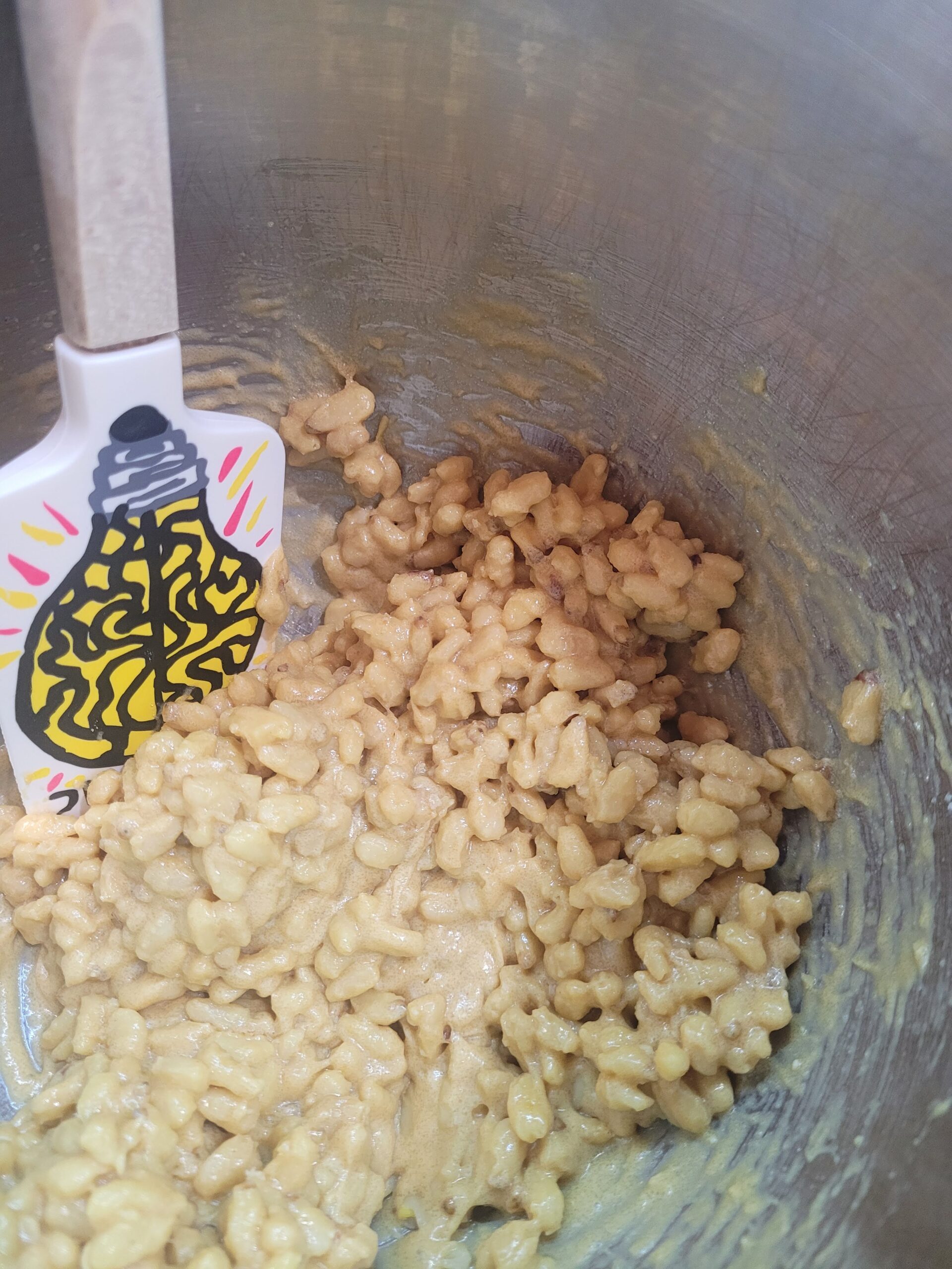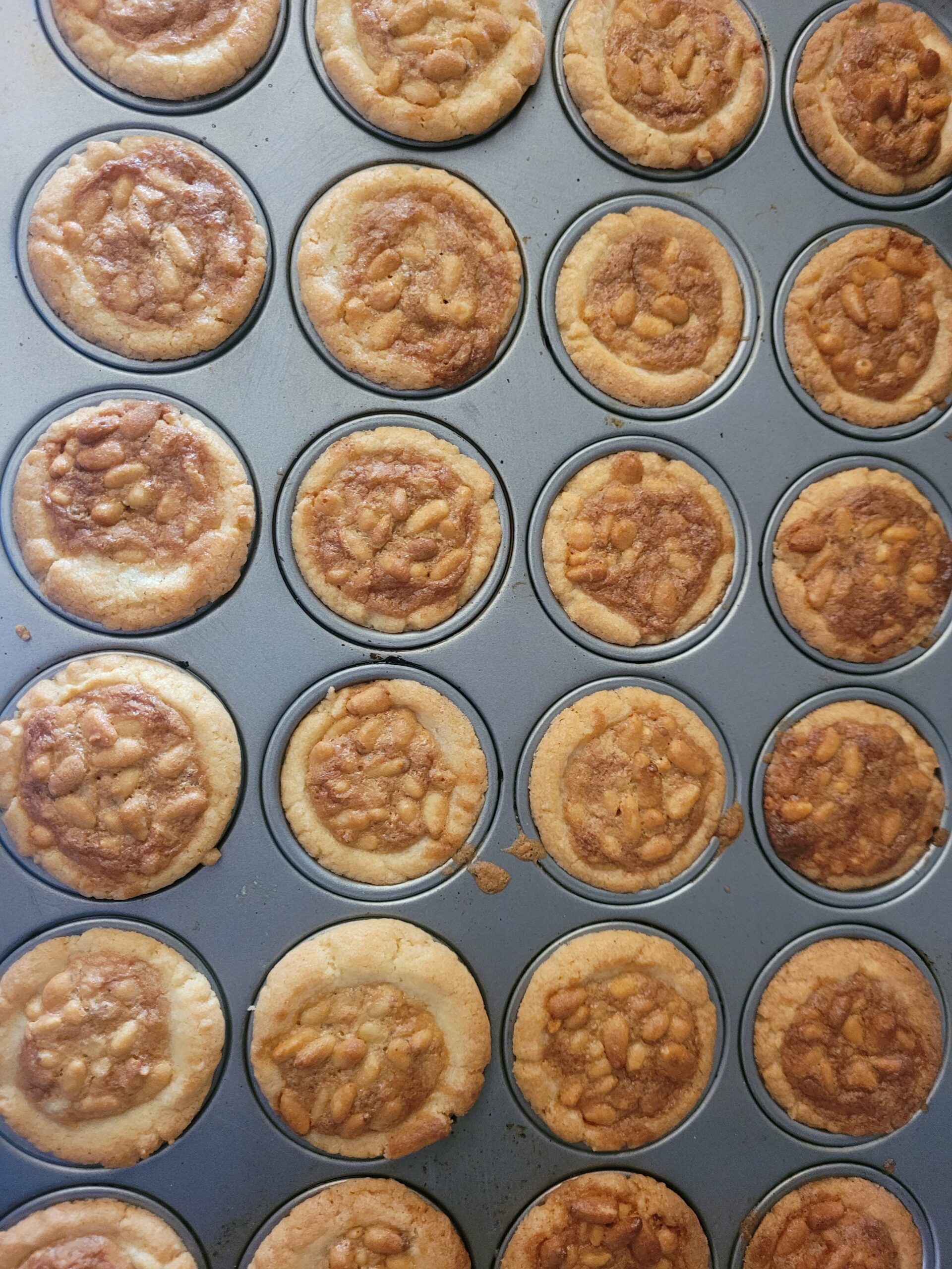 - Whisk together the brown sugar, butter, egg, vanilla and salt until well blended. (Feel free to also use a blend for this.) Stir in the pine nuts. Fill each pastry shell. (This could be anywhere from 2 t. to 1 full T., again, depending on the size of your tins.)