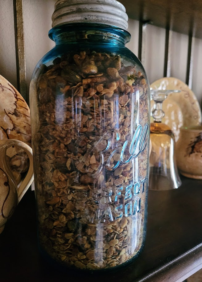 I do love that this uses honey (but this is a not-too-sweet granola). I’m not a big fan of egg white granola, but I have to say that I’m a convert with this one. The recipes makes a little more than a half-gallon.