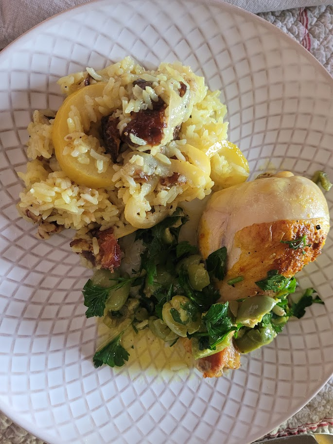Here is my somewhat sloppily plated meal of her Toasted Rice Pilaf with Walnuts & Dates along with the Crushed-Olive Chicken with Turmeric. She recommends these be served together. The chicken was a simple sheet pan recipe, just chicken pieces sprinkled with turmeric and then braised in the oven with some vinegar. Then an olive, lemon, garlic, parsley salad is placed on top when plated. I cannot tell you how much I love that rice dish. I honestly think it would be good on its own for dinner. I believe I remember Roman suggesting a dollop of Greek yogurt on top. I’m trying that next. These two recipes are staying in my repertoire.